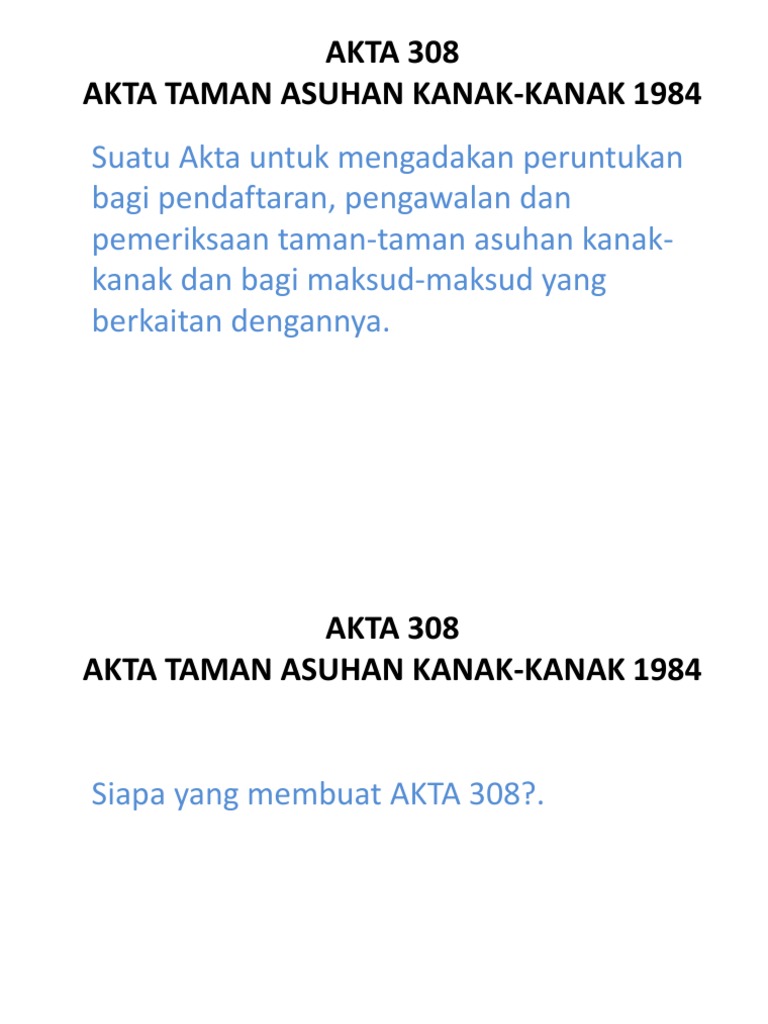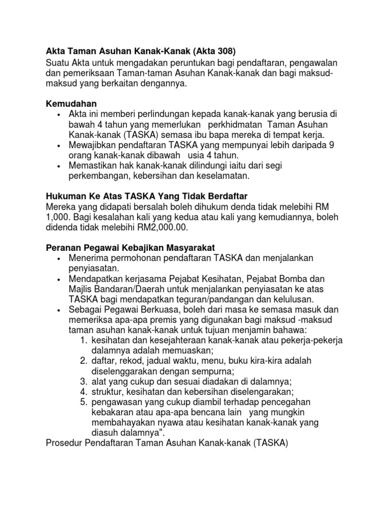 Akta Taman Asuhan Kanak-Kanak 1984 - (4) untuk menubuhkan taska ,pengurus hendak mendapat.. 2 1 akta taman asuhan kanak kanak 1984 pindaan 2007. Kurikulum tk ditekankan pada pemberian rangsangan pendidikan untuk membantu pertumbuhan dan perkembangan jasmani dan rohani agar anak memiliki kesiapan. Pendaftaran boleh dibatalkan jika tidak mematuhi peraturan, tidak memaklumkan perubahan terkini dan pemilik yg tidak berakhlak. Kemudahan akta ini memberi perlindungan kepada. Child care centre act 1984 act 308.
