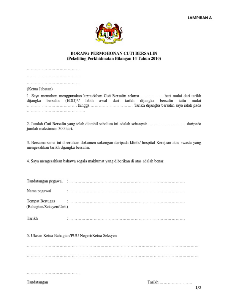 Borang kemudahan cuti bersalin pegawai perkhidmatan awam. Hal ini berikutan dengan pemindaan akta kerja 1955 yang mana membolehkan perkerja swasta wanita boleh mengambil cuti bersalin daripada 60 hari kepada 90 hari. Menurut pekeliling perkhidmatan bilangan 5 tahun 2014, perenggan 8: Cuti bersalin ialah sejenis faedah pekerja yang memberikan cuti bergaji untuk pekerja (lazimnya wanita) bersalin dan membesarkan anak. Dengan ini mengajukan permintaan cuti tahunan untuk 2019 selama 6 (enam) hari kerja, terhitung mulai tanggal 22 juni 2019 s/d 30 juni 2019.