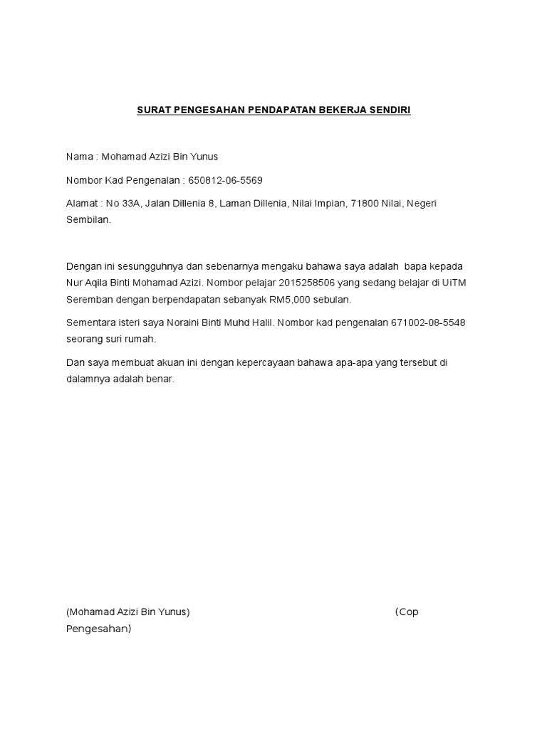 Rasmi Contoh Surat Pengesahan Pendapatan Bekerja Sendiri from imgv2-2-f.scribdassets.com Maybe you would like to learn more about one of these? We did not find results for: Check spelling or type a new query.